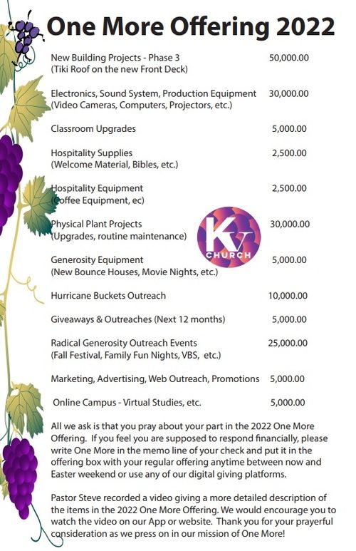 All we ask is that you pray about your part in the 2022 One More Offering. If you feel like you are supposed to respond financially, please write One More in the memo line of your check and put it in the offering box with your regular offering anytime between now and Easter weekend or use any of our digital giving platforms.
