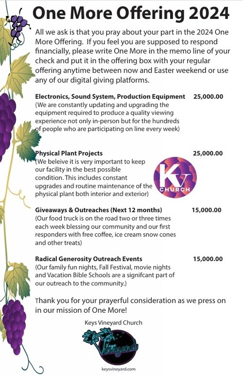All we ask is that you pray about your part in the 2024 One More Offering. If you feel like you are supposed to respond financially, please write One More in the memo line of your check and put it in the offering box with your regular offering or use any of our digital giving platforms.